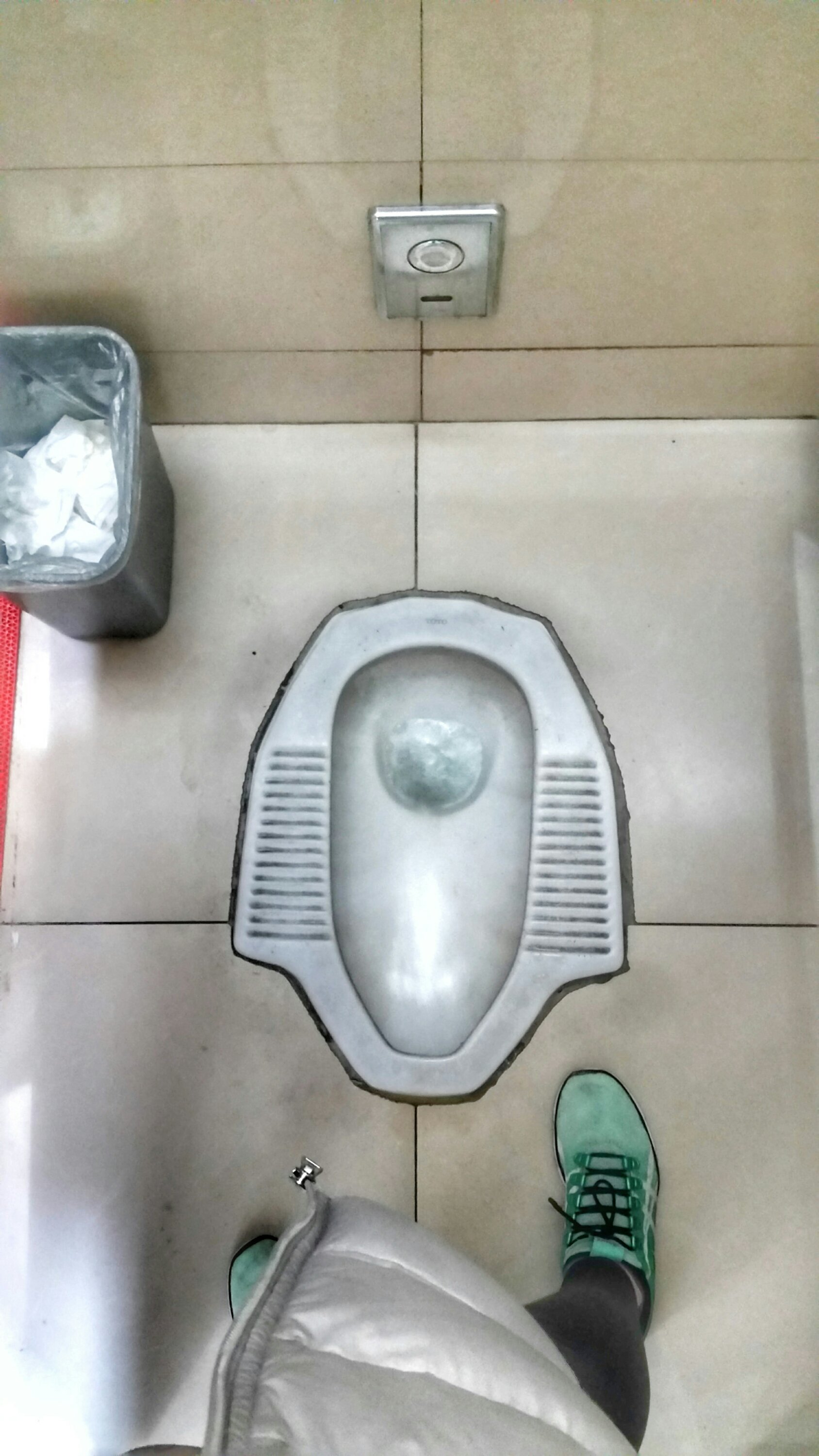 Basically, you drop your drawers, squat down and aim for the pot. The catch is that not all bathrooms have doors or stalls. Some have a simple waist high partition between you and the person squatting next to you.
